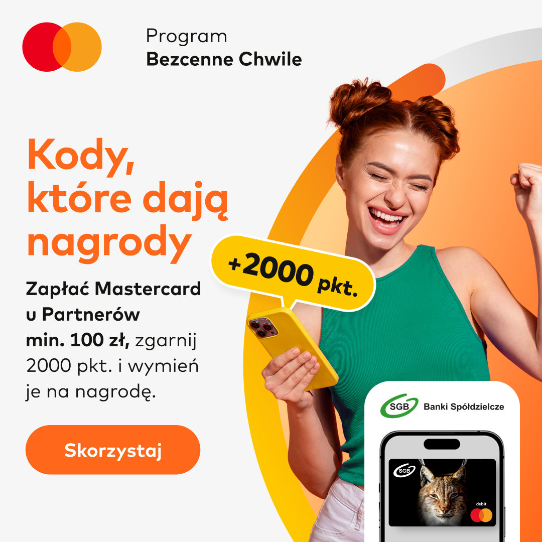 Ruszyła promocja, w której zgarniesz aż 2000 punktów w programie Bezcenne Chwile! Płać kartą Mastercard z logo SGB u Partnerów programu i zgarnij promocyjne punkty, które wymienisz na nagrody. Czeka na Ciebie np. voucher 20 zł na zakupy do znanych...